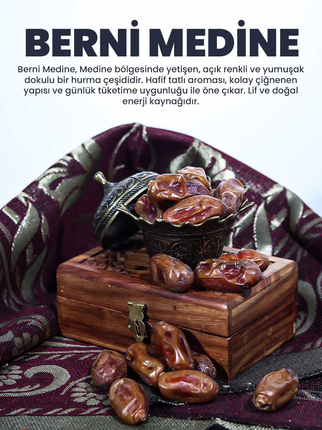 Berni Medine hurması, Peygamber Efendimiz’in (s.a.v.) hadislerinde adı geçen nadir hurma çeşitlerinden biri olarak bilinir. Anavatanı Medine olan bu özel hurma; iri yapısı, tok dokusu ve dengeli tat profiliyle öne çıkar. Berni hurması ne aşırı tatlıdır ne de serttir; bu yönüyle günlük tüketim için ideal, uzun süre tok tutan doğal bir besindir. Medine ikliminde yetişmesi sayesinde mineral ve lif açısından zengin bir yapıya sahiptir.